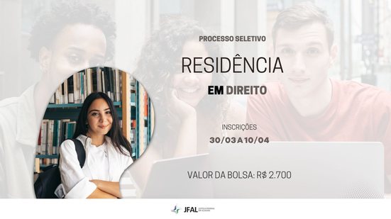 A Justiça Federal em Alagoas (JFAL) fará processo seletivo com vistas à formação de cadastro reserva da Residência Judicial. As inscrições começam na segunda-feira, 30, e vão até o dia 10 de abril, pelo site da instituição, na aba concursos e seleções. O Programa de Residência Judicial terá duração de 36 meses, contados a partir da homologação do resultado final, com jornada semanal de 36 horas. A bolsa-auxílio é de R$ 2.700 e auxílio transporte de R$ 12, para os dias de atividade presencial.