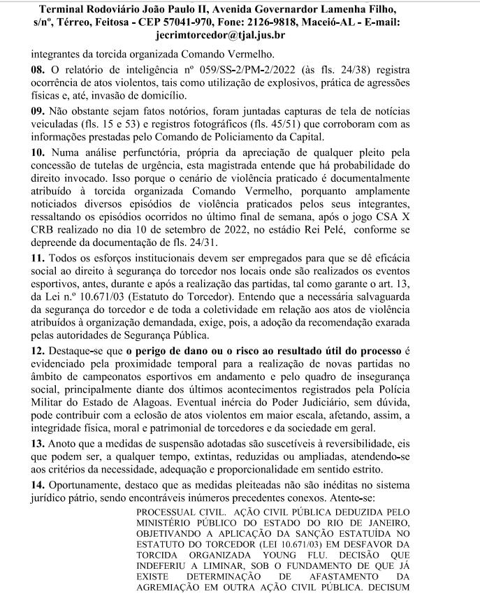 Em sua decisão, a magistrada levou em consideração os argumentos do MPE, onde constam os registros de atos violentos praticados pela torcida Comando Vermelho. Nesse último sábado, integrantes da organizada tentaram invadir a casa de um homem, que segundo testemunhas, seria um torcedor do CSA. Durante a ação, eles chegaram a arremessar uma 'bomba manual' dentro da casa, um artefato caseiro composto por pólvora, pregos, bolas de gude e outros objetos.