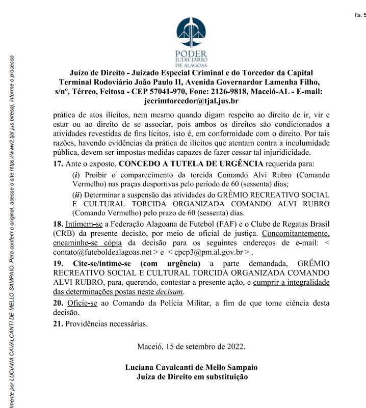 A juíza Luciana Cavalcanti de Mello Sampaio, do Juizado Especial Criminal e do Torcedor da Capital, acolheu ação do Ministério Público Estadual e decidiu suspender as atividades da torcida organizada do CRB, Comando Vermelho, por 60 dias. A decisão da Justiça alagoana acontece cinco dias após o registro de atos de violência realizados pela torcida regatiana logo depois do clássico contra o CRB, no sábado (10).