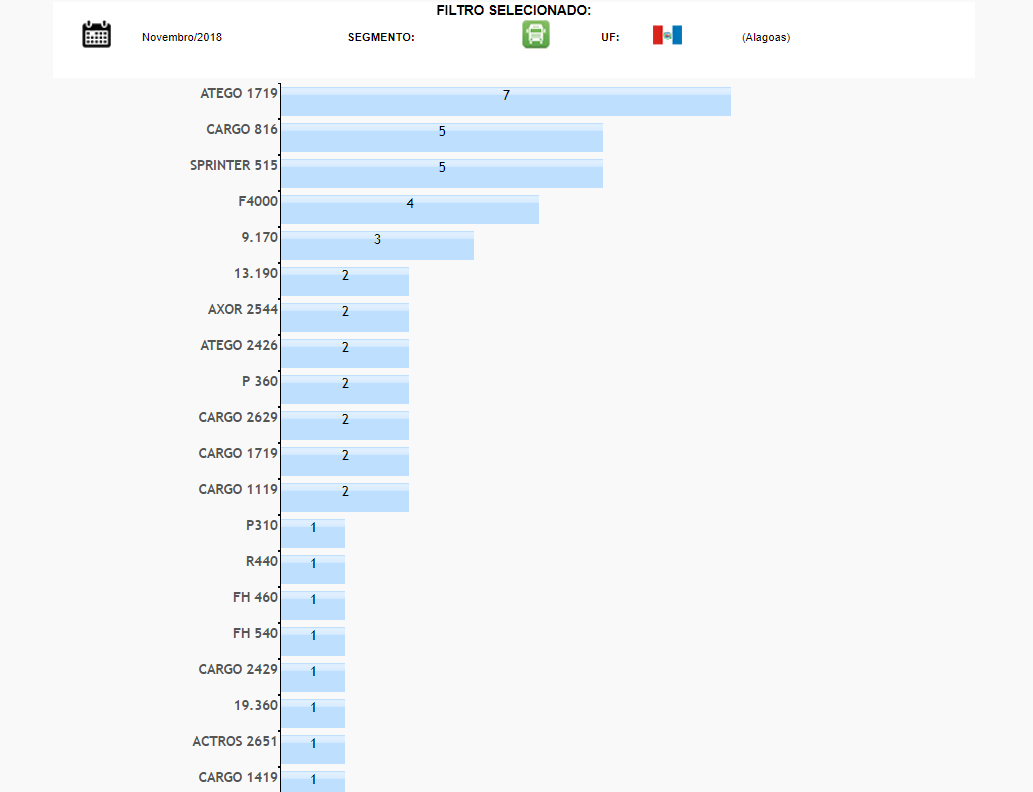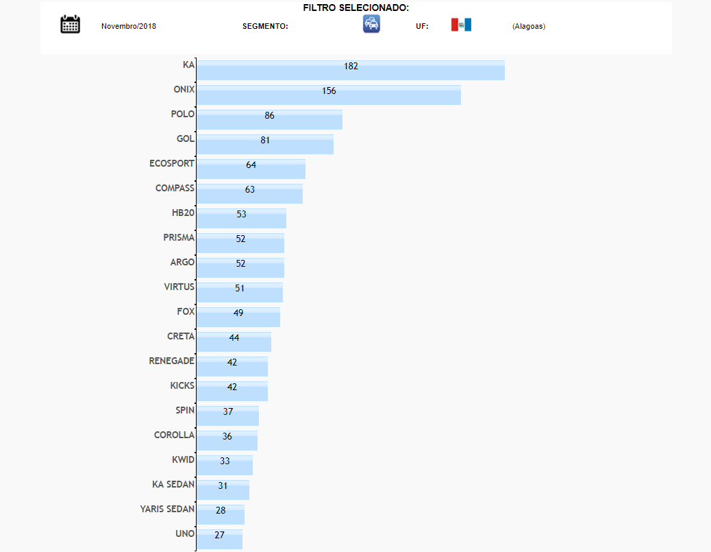 Vendas de automóveis em Alagoas em novembro de 2018. Fonte: Fenabrave