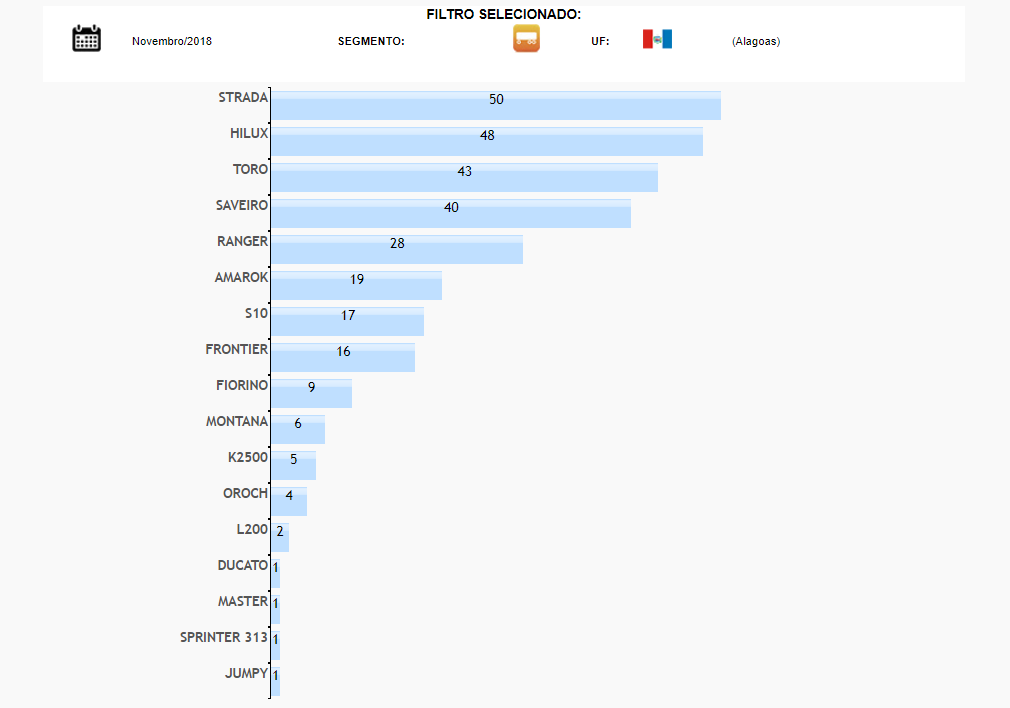 Vendas de comerciais leves em Alagoas em novembro de 2018. Fonte: Fenabrave