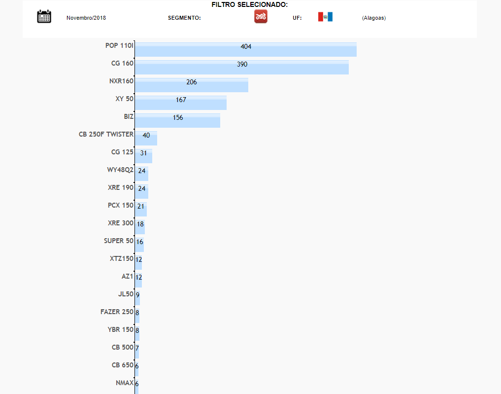 Honda Pop 110i debancou a CG160 em Alagoas no mês de novembro. Fonte: Fenabrave