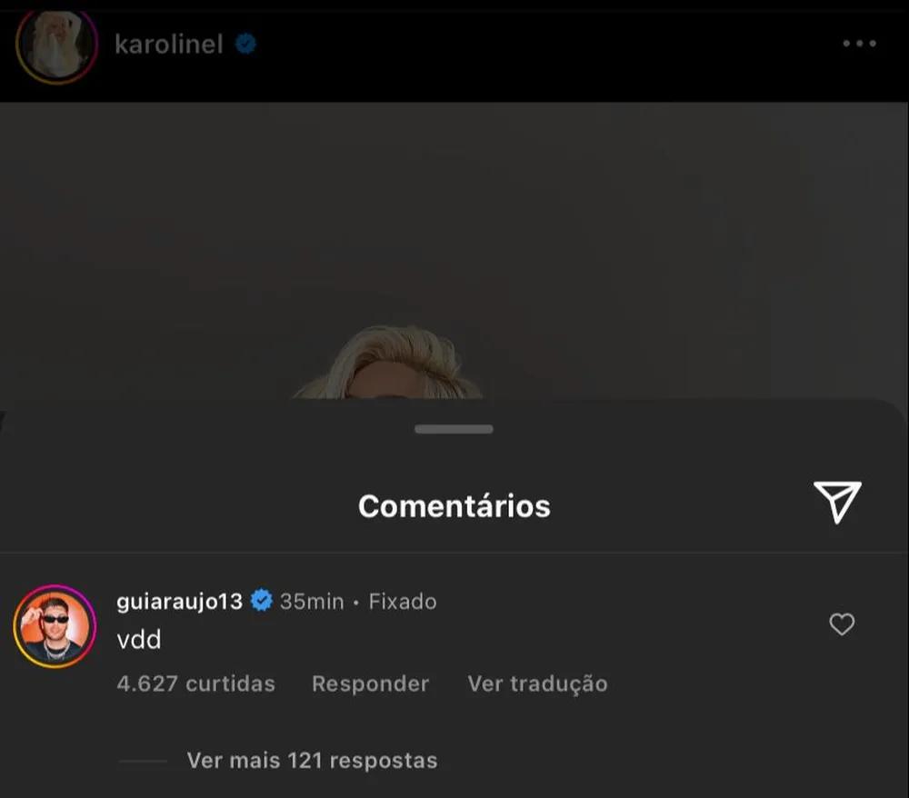 Karoline Lima agitou as redes sociais ao usar um cropped com a frase "meu ex é o meu maior fã". A loira postou registros com a blusa em seu perfil do Instagram e teve a afirmação da roupa confirmada pelo seu ex-namorado mais recente, o influenciador Gui Araújo. O rapaz, que mantém uma relação amigável com Karoline, comentou "verdade", na postagem da ex.