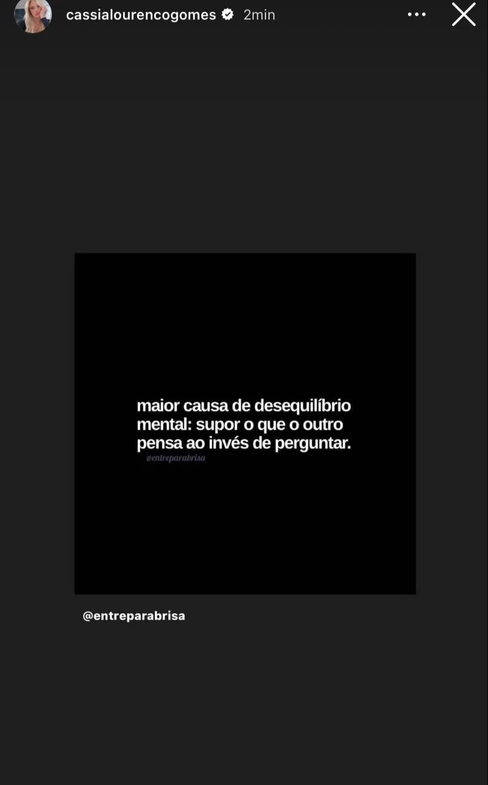 Quem parece não ter gostado nadinha da roupa vestida por Karoline é Cassia Lourenço, nova namorada de Éder Militão, com quem a influenciadora já foi casada e tem uma filha. Minutos depois que Karol postou fotos usando o cropped polêmico, Cassia compartilhou uma indireta em seus stories: "Maior causa de desequilíbrio mental: Supor o que o outro pensa ao invés de perguntar".