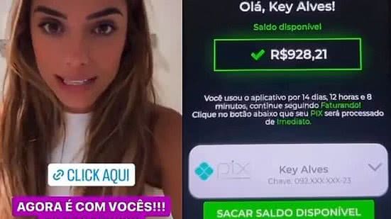 "Sério, consegui um aplciativo que paga para usar as redes sociais. Vou mostrar para vocês. O tanto que consegui só curtindo story. Esse é meu saldo disponível (R$ 928,21). Vou sacar, já está cadastrada minha chave do pix. É muito dinheiro fácil, vai cair direto na minha conta", disse Key, mostrando o saldo.