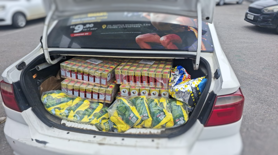Os suspeitos foram abordados no estacionamento do local, quando já estavam com os produtos no carrinho de compras a caminho do veículo usado para a fuga. A dupla, que deixou o supermercado sem passar pelo caixa para fazer o pagamento, ainda tentou escapar. Os pacotes de alimentos foram colocados na mala do HB20, de cor branca, posteriormente apreendido pelos PMs.