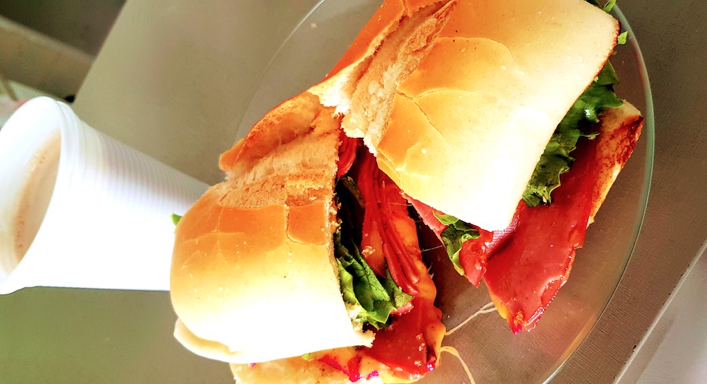 O meu predileto é pão francês na chapa, mortadela, queijo do reino, tomate e alface. Mas a pedido do Eduardo Jorge, sócio da padaria, provei o hambúrguer bovino artesanal, de largura fina no pão redondo, queijo mussarela, tomate e alface, também uma boa pedida. O hambúrguer é produzido na panificação e também congelado para levar para casa. Detalhe: a carne não tem sal, então lembrar na hora de preparar adicionar o sal e pimenta do reino (eu esqueci!).