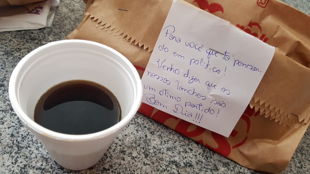 O café é cortesia e as embalagens de entrega vem sempre com um bilhetinho escrito a mão