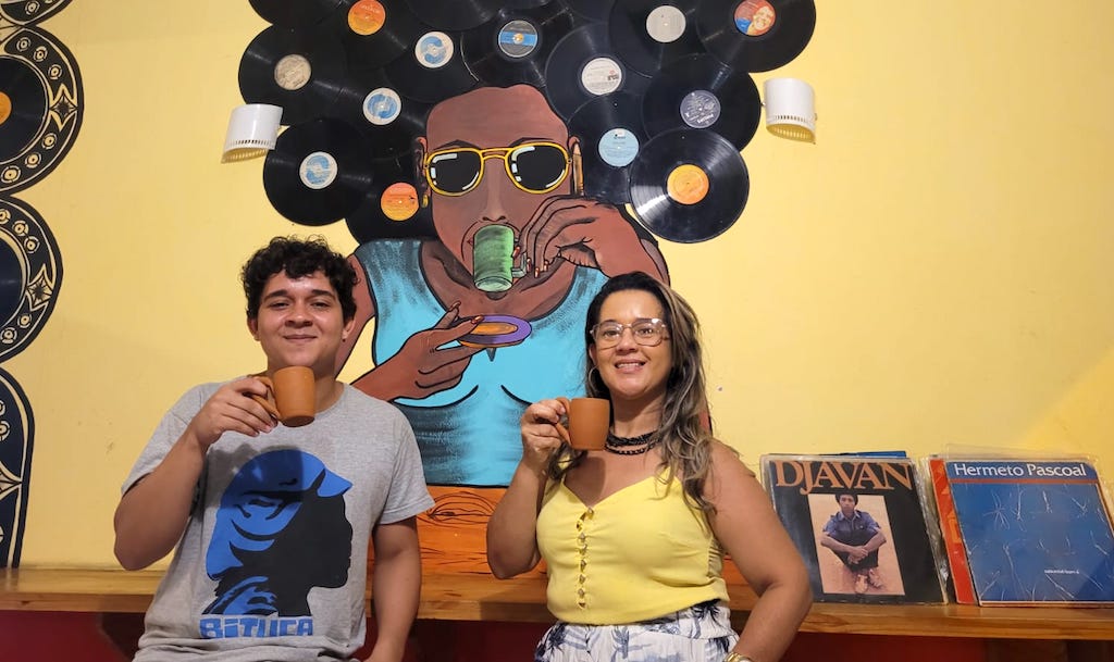Nadja e o filho Goodson, ela cozinheira de mão cheia e ele apaixonado por vinil. Na parede homenagem a Cartola