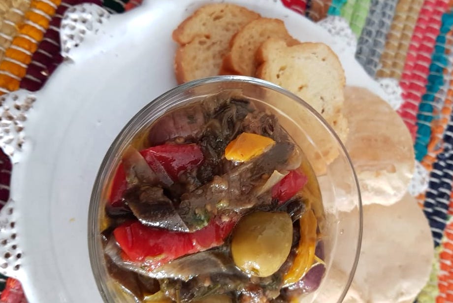 Caponata Italiana com berinjela, cebola, pimentões, vinagre balsâmico, azeite e alcaparras