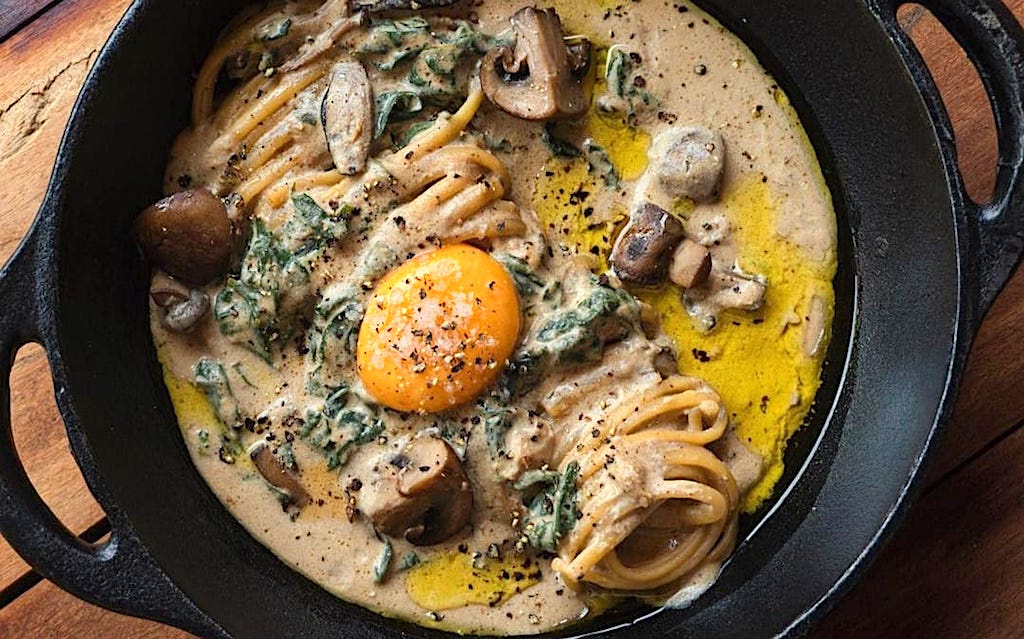 Linguine ao molho de cogumelos é uma receita que traz felicidade para todos, em especial aos vegetarianos. A massa vem com os cogumelos frescos (cultivados em Alagoas) e espinafre, mergulhados no molho com manteiga, creme de leite e azeite trufado. A gema de ovo caipira é o arremate final do prato.