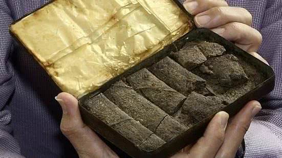 O recipiente, contendo várias barrinhas de chocolate, foi achado em uma caixa abandonada no sótão de uma residência em Lincolnshire (Inglaterra).