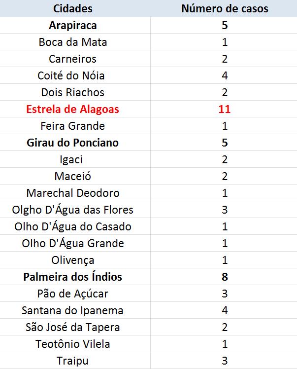 Até o momento, foram registrados 15 casos a mais que todo o ano passado. As cidades que mais registraram a doença foram Estrela de Alagoas, com 11 casos, e Palmeira dos Índios, com 8 casos. Ambas ficam localizadas no Agreste do Estado.