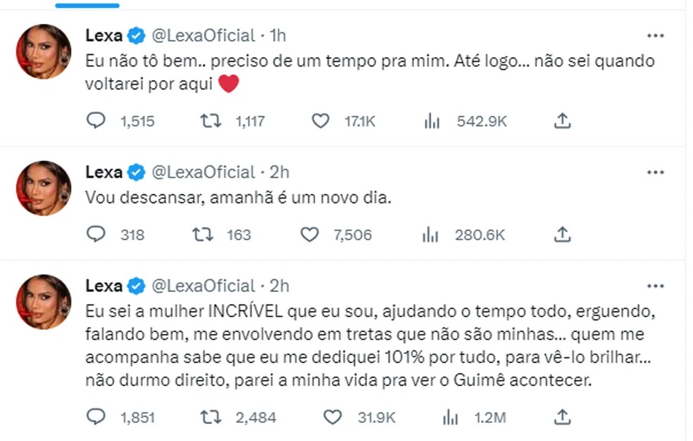 "Eu sei a mulher incrível que eu sou, ajudando o tempo todo, erguendo, falando bem, me envolvendo em tretas que não são minhas… Quem me acompanha sabe que eu me dediquei 101% por tudo, para vê-lo brilhar… Não durmo direito, parei a minha vida pra ver o Guimê acontecer", começou Lexa.