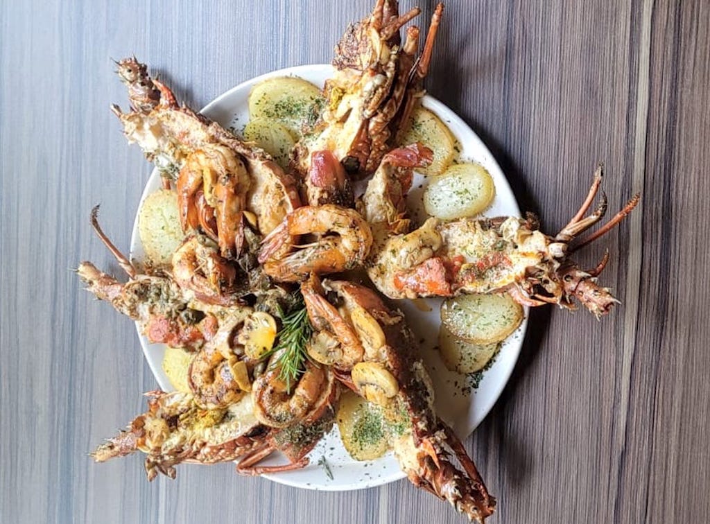 Lagosta de Capri: as lagostas no molho de alcaparras com camarões na manteiga de ervas, batatas douradas