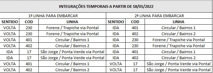 Também será possível fazer integrações, para isso é preciso ficar atento ao sentido das viagens, conforme tabela abaixo: