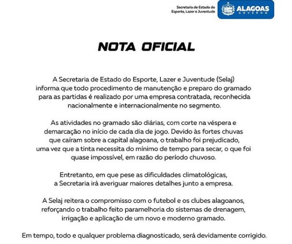 Por meio de nota, a Secretaria de Estado do Esporte, Lazer e Juventude (Selaj) informou que o procedimento de manutenção e preparo do gramado para os jogos é realizado por uma empresa contratada e destacou que o último trabalho foi prejudicado por causa das chuvas, pois não houve tempo para secar. Veja abaixo: