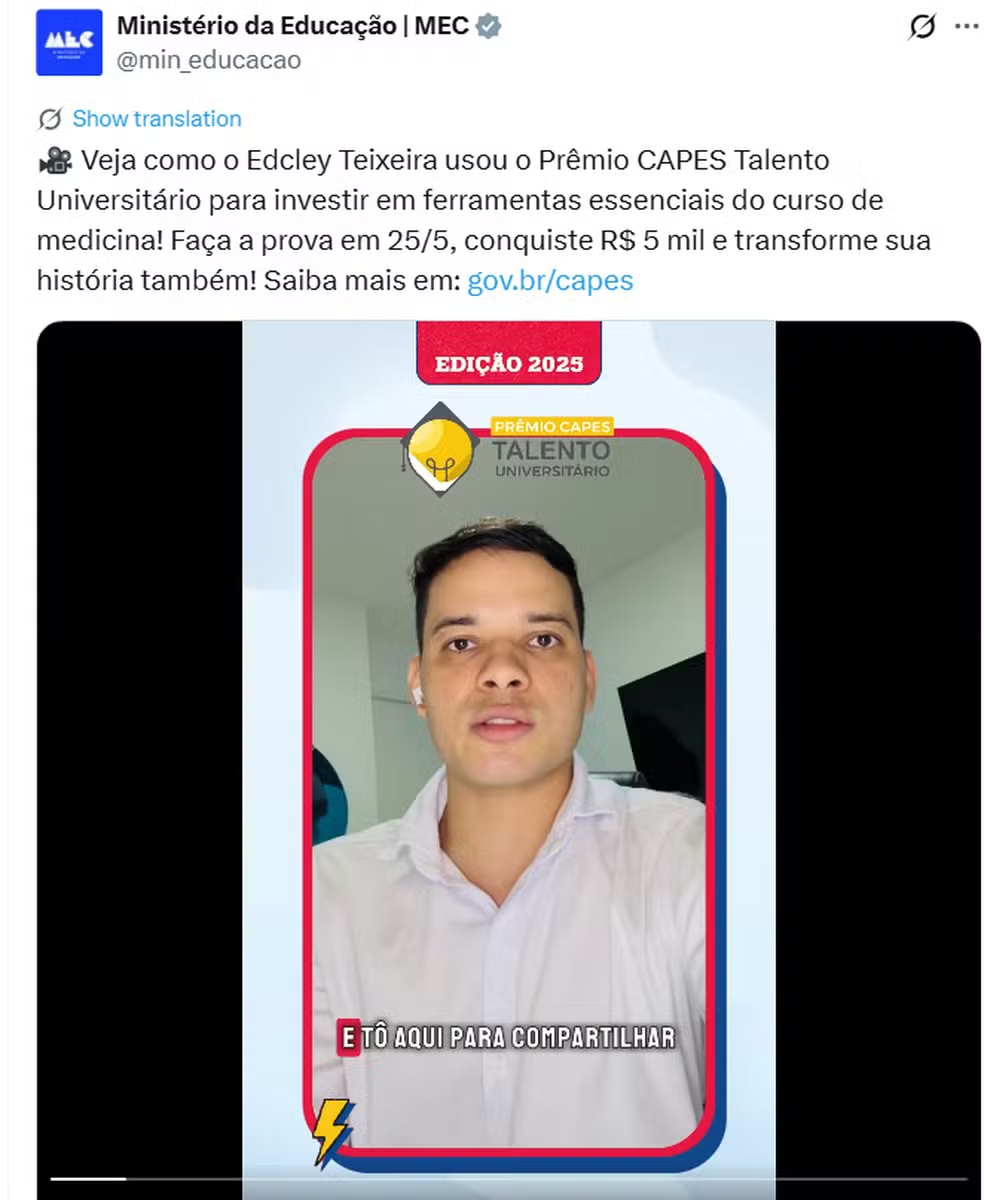De fato, há um post do ministério, de 22 de maio deste ano, em que este homem agradece pela participação no Talento Universitário e pelo prêmio de R$ 5 mil;