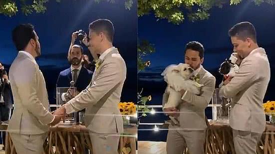 Os cachorrinhos do youtuber entraram vestidos de noivos para levar as alianças. "Filha, você quase não entra, rapariga!", brincou ele para a cadelinha Valentina que tentou desviar o caminho do altar.