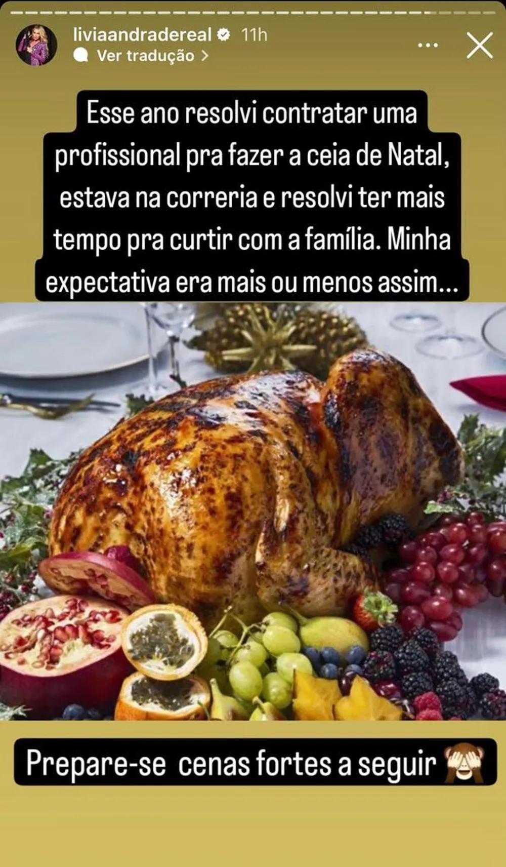Lívia Andrade, de 40 anos, contou nos Stories do Instagram, nesta terça-feira (26), que teve uma experiência traumática na véspera de Natal. De acordo com a apresentadora, que integra o time do Domingão com Huck, da Globo, ela contratou um bufê para preparar a ceia, mas foi surpreendida ao ver o resultado. Ela mostrou qual era a sua expectativa e qual foi a realidade entregue.