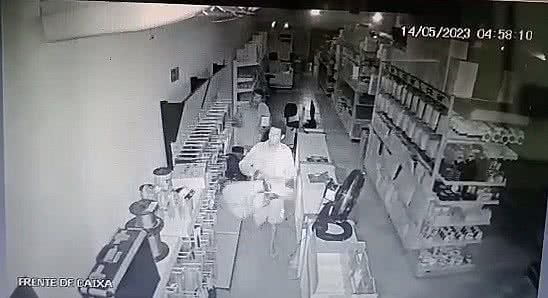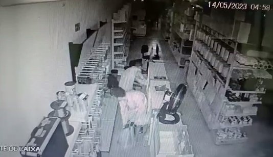 As imagens divulgadas pela polícia mostram o momento em que duas pessoas praticam o crime na madrugada de domingo. Na gravação da área externa, a dupla se aproxima da entrada da loja e derruba um tapume de madeira para ter acesso ao estabelecimento, já que dois dias antes, a vidraça do local havia sido quebrada em uma outra invasão.