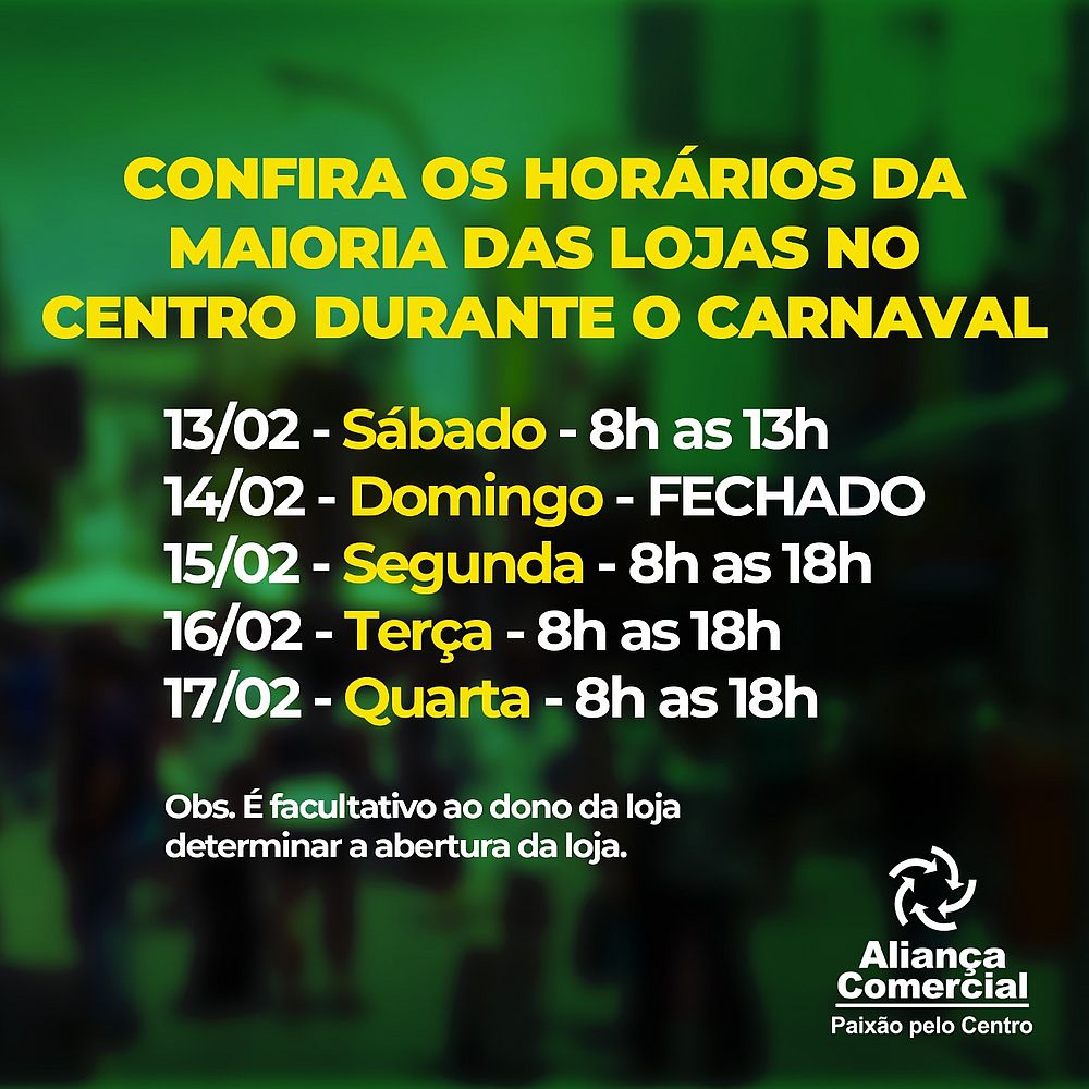 A Aliança Comercial de Maceió informou, na tarde desta segunda-feira, 8, que a maioria das lojas do Centro de Maceió vão funcionar normalmente no período de Carnaval, de sábado, dia 13, até a Quarta-feira de Cinzas, dia 17. Segundo a entidade, a abertura das lojas não é obrigatória e ficará a critério do proprietário do estabelecimento.