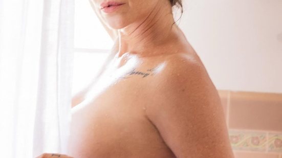 As imagens mostram Luana no banheiro, sem roupas, com bobs nos cabelos e parcialmente coberta por uma cortina. O ensaio, simples e direto, contrasta com a legenda carregada de indignação que acompanha os cliques.