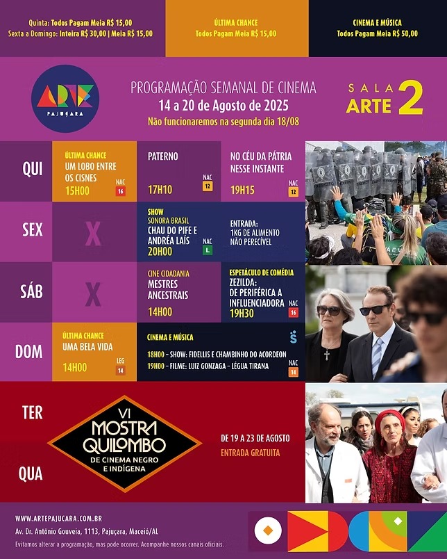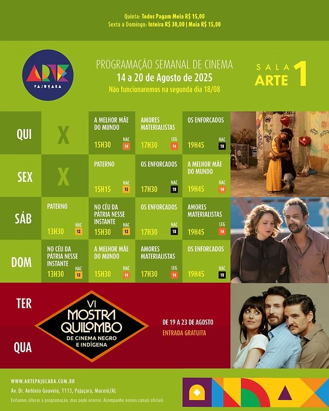 Para conferir a programação completa de todos os filmes em cartaz no Arapiraca Partage Shopping, Centerplex (Shopping Pátio Maceió), Cinesystem (Parque Shopping) e Kinoplex (Maceió Shopping): basta clicar aqui. Já para o Shopping da Vila, em Delmiro Gouveia, pode ser conferida aqui.