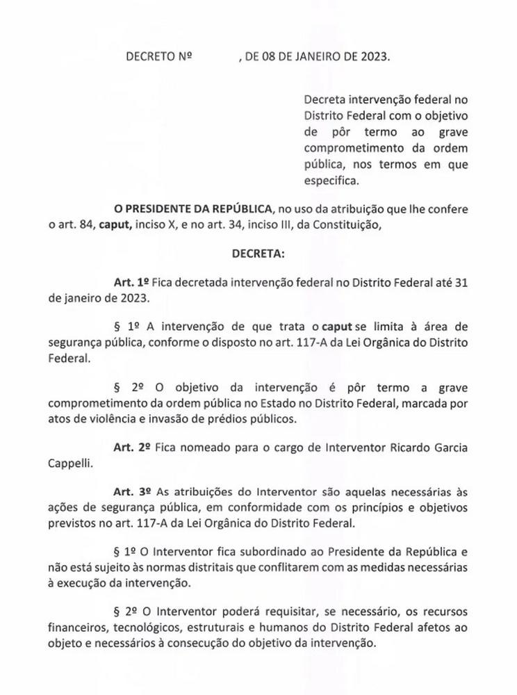 O presidente Luiz Inácio Lula da Silva anunciou, neste domingo (8), a decretação de intervenção federal no Distrito Federal, em resposta, aos atos antidemocráticos que invadiram e depredaram os prédios do governo em Brasília nesta tarde.