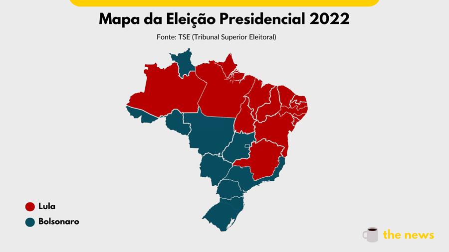 O petista venceu em 14 estados, enquanto Bolsonaro venceu em 12 e no DF. Destaque para a cor de Minas, que sempre é decisivo, além de Amapá, Tocantins e Amazonas, onde Jair havia ganhado em 2018.