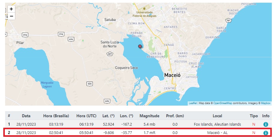 O Observatório Sismológico da Universidade de Brasília (SIS-UnB) registrou o tremor de magnitude 1.7mR, às 02h50m41s desta terça-feira, 28, em Maceió (veja na foto abaixo).