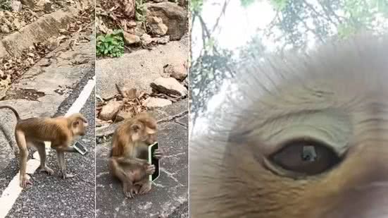 O macaco pode ser visto andando no asfalto e correndo para cima de uma árvore, com o celular na mão, antes de colocá-lo no modo selfie.