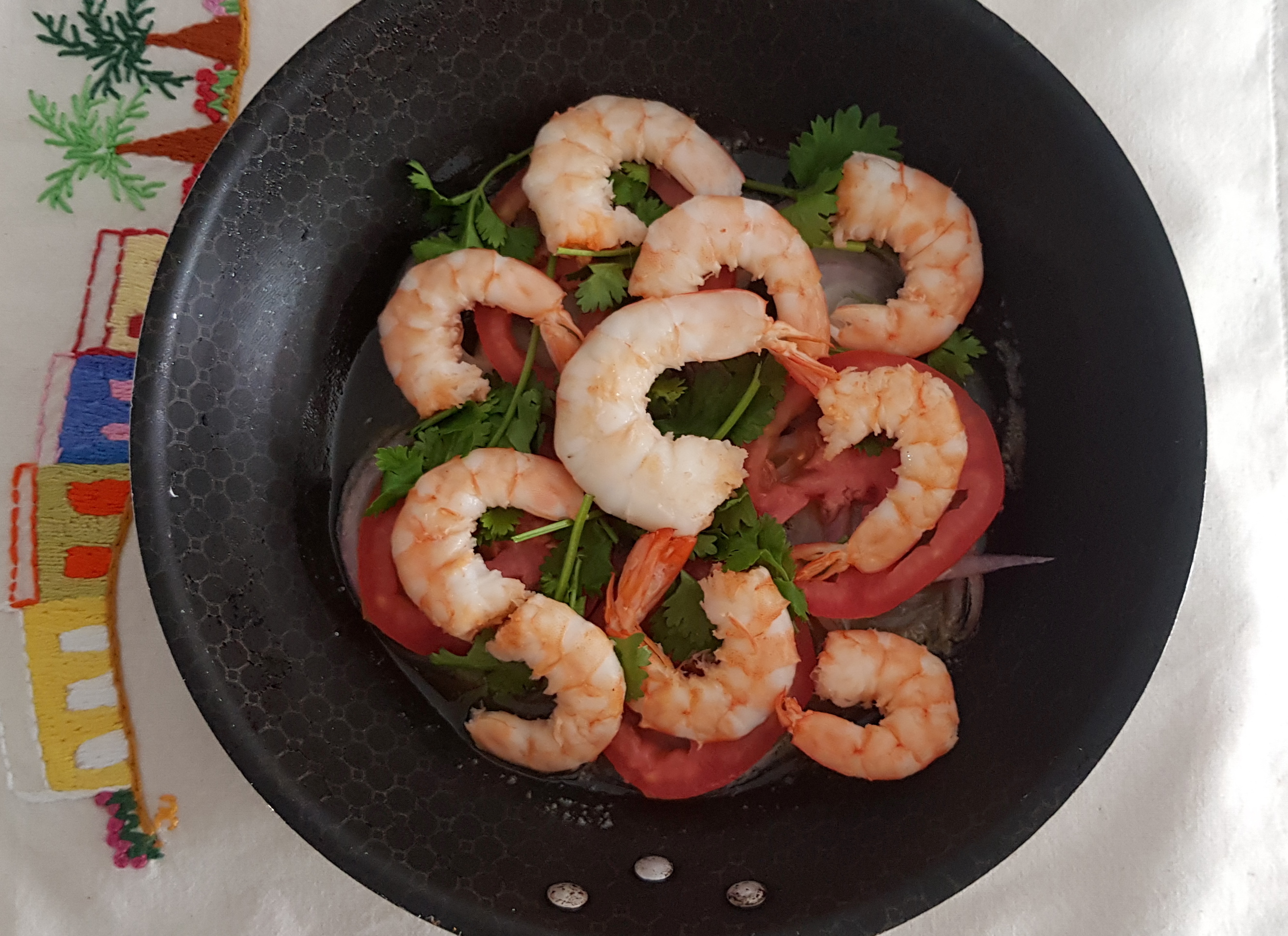 O camarão barba roxa basta adicionar na frigideira depois de refogar com uma colher de manteiga com tomate, cebola e coentro.