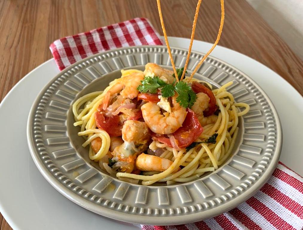 Tirei foto da minha macarronada de camarão, postei na internet e perguntei se queriam receita. Os seguidores disseram sim, mas o chef Thiago Brandão (@tbrandaos) foi mais longe e respondeu que queria provar. Assim sendo, compartilho com vocês o jeito como gosto de comer em casa, preparada na manteiga do Sertão, com rodelas de tomate, cebola roxa, coentro, sal, um ovo de gema mole, e finalizada com queijo parmesão e azeite. A receita é inspirada no macarrão de dona Nia, minha mãe, porque na mesa da minha família sempre tinha o espaguete de marca alagoana: apenas na manteiga, colorau, tomate, cebola e pimentão. Até hoje meu predileto, modesto e bom.