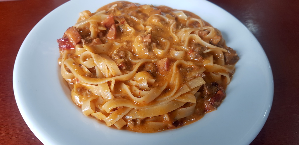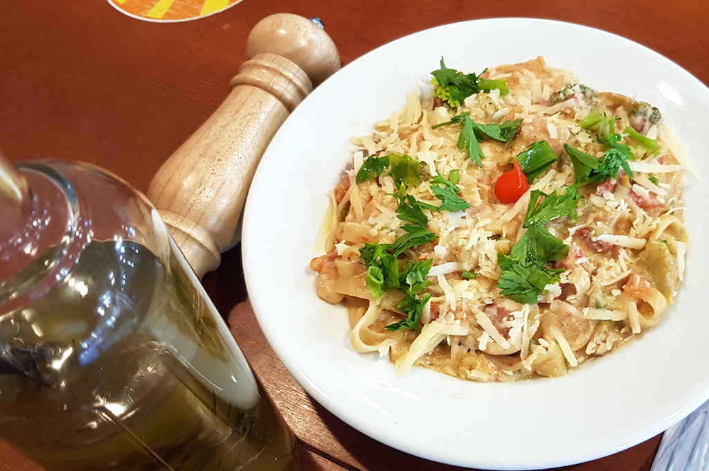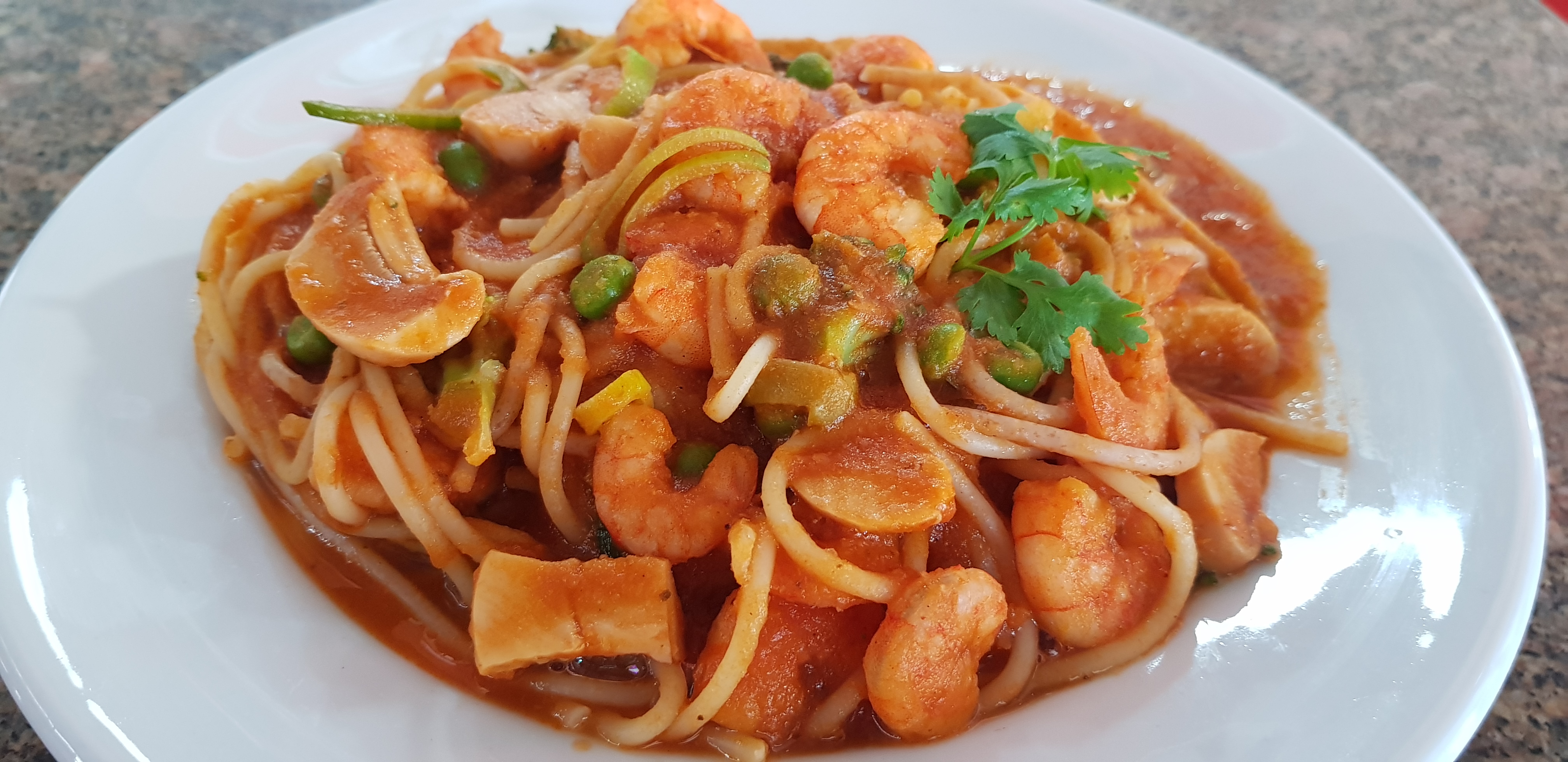 Mercado de Massas: Espaguete com camarão no molho de tomate no Mercado do Jaraugá
