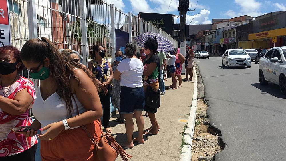Um grupo de pessoas se organizou em fila na calçada na Rua Cleto Campelo, no Jacintinho, já fora da área do Ginásio Arivaldo Maia, outro ponto de vacina, para esperar a vez. Dentro do espaço, já havia um grande número de usuários.