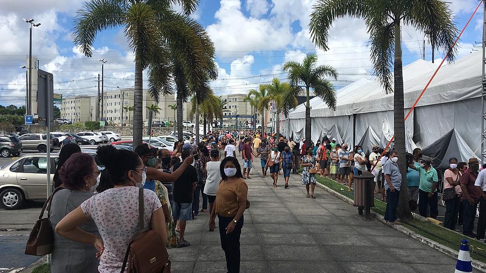 No estacionamento do Jaraguá, o "corredor" de carros havia chegado até o Hotel Ouro Branco, situado no bairro de Pajuçara, ou seja, cerca de 2 km de fila. A vacinação ocorre em formato drive-thru.