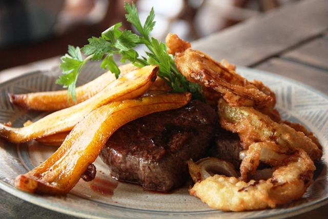 Akuaba: É além dos frutos do mar, tem o filé á moda de Vera, merece toda atenção. A carne macia vem com banana da terra e cebola milanesa