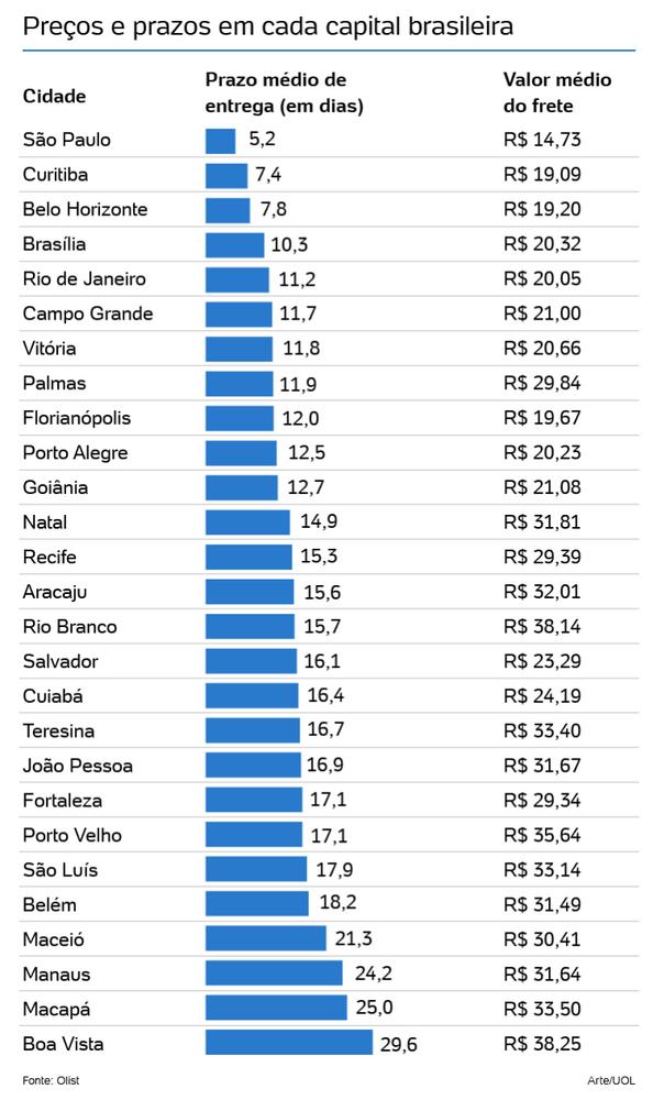 Se você mora em São Paulo, a média de entrega é de pouco mais de cinco dias e o custo médio do frete é de R$ 14,73. Já se a entrega for para Boa Vista (RR), terá que esperar quase 30 dias pela entrega da mesma compra e ainda pagará mais caro - R$ 38,25.
