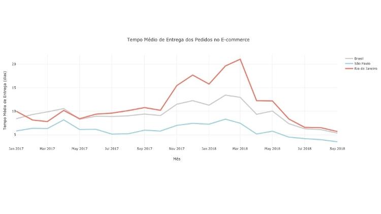 No entanto, o mês que apresentou a maior variação no tempo de entrega foi março de 2018. Segundo o especialista do Olist, a greve dos Correios e o reajuste das tabelas de frete impactaram as entregas no período. Confira: