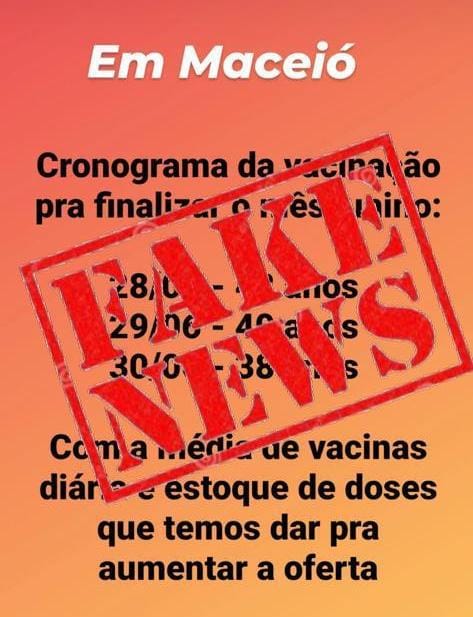 A Prefeitura de Maceió informa que é falso o cronograma que circula nas redes sociais que indica a vacinação contra a Covid-19 para pessoas com 38 anos até o dia 30/06.