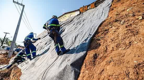 Paralelamente, outros locais recebem ações de proteção, com aplicação de geocomposto em PVC, uma tecnologia duradoura que garante uma proteção em larga escala de encostas de menor dimensão e declividade.