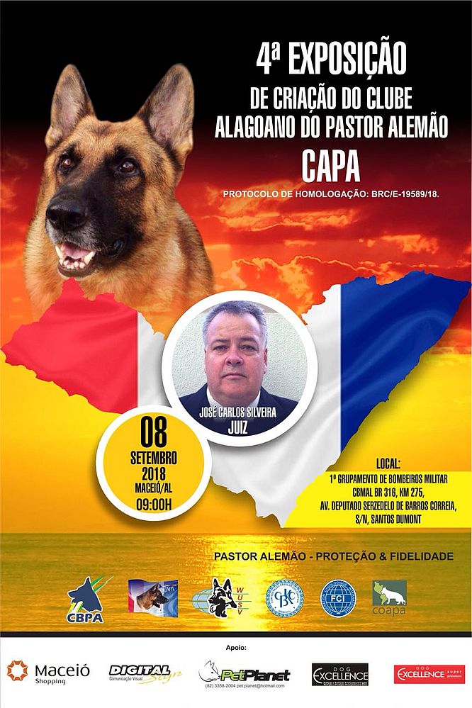 Maceió vai ser sede, no próximo sábado (08), da 4º Exposição de Criação do Clube Alagoano do Pastor Alemão. O evento acontecerá a partir das 9h, no 1º Grupamento de Bombeiros Militar de Alagoas, na Avenida Deputado Serzedelo de Barros Correia, no bairro Santos Dumont, parte alta de Maceió.