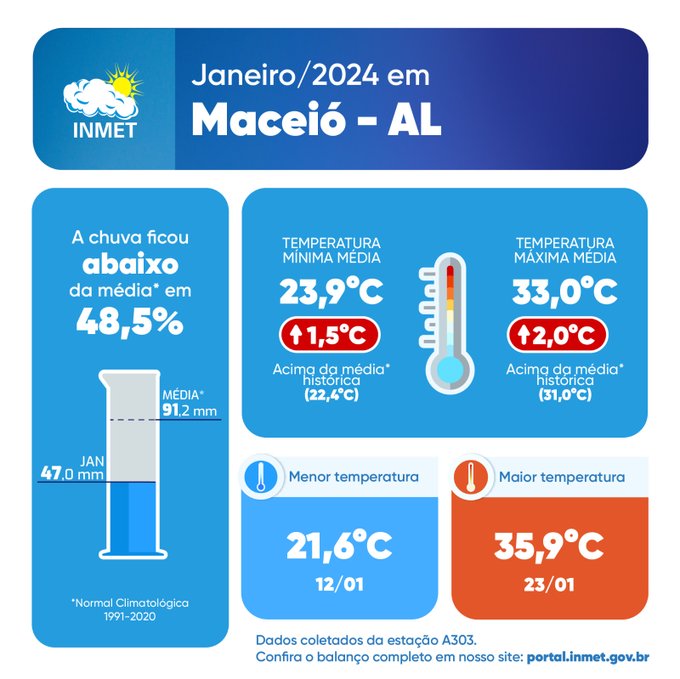 Chuvas abaixo da média para o mês de janeiro - Segundos os dados do Inmet, em janeiro de 2024, o total de chuva registrado na estação automática em Maceió foi de 47,0 milímetros. Esse valor corresponde a aproximadamente 48,5% abaixo da normal climatológica da estação convencional (1991-2020), que é de 91,2 mm.
