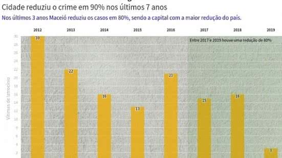 A queda no número de latrocínios na capital alagoana é ainda maior quando analisados os dados de 2012 a 2019. Neste período a capital registrou uma redução de 90%, saindo de 30 casos para apenas 3. Alagoas também apresentou uma queda expressiva, já que em 2012 registrou 96 casos de latrocínio, mas em 2019 teve apenas 18 em todo o estado, representando uma redução de 81,25%.