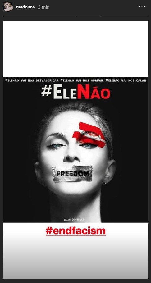 Na imagem creditada a Aldo Diaz, Madonna usou a hashtag na imagem e os dizeres: “ele não vai nos desvalorizar”, “ele não vai nos oprimir”, “ele não vai nos calar”. Abaixo da imagem, Madonna ainda pede que “acabem com o fascismo”.