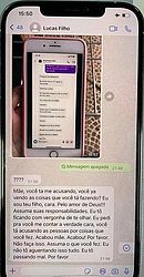 Cíntia então escreve algo que apaga logo depois, e Lucas responde: “Mãe, você tá me acusando, você tá vendo as coisas que tá fazendo? Eu sou seu filho, cara. Pelo amor de Deus! Assuma suas responsabilidades. Eu tô ficando com vergonha de te olhar. Eu pedi para você me contar a verdade, cara, você tá acusando as pessoas por coisas que você fez. Acabou, mãe. Acabou. Por favor! Não faça isso. Assuma o que você fez. Eu não tô aguentando isso tudo. Eu tô passando mal. Por favor”.