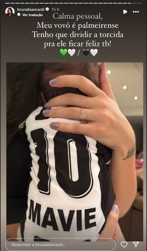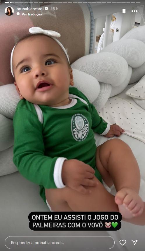 Bruna publicou uma foto da bebê usando um uniforme do Palmeiras, nesta sexta-feira (29). Na legenda da foto, ela explica que Mavie assistiu ao jogo do Alviverde na companhia do avô e pai da modelo. O Palmeiras venceu o Novorizontino por 1 a 0 na última quinta-feira (28) e avançou para a final do Campeonato Paulista.