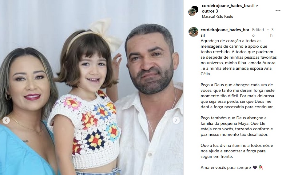 Que a luz divina ilumine a todos nós e nos ajude a encontrar a força para seguir em frente. Amarei vocês para sempre", publicou Cordeiro Joane, marido de Ana e pai de Aurora.