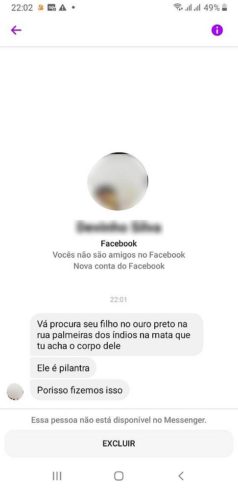 "Depois, nada do meu filho chegar. Liguei pra ele e o celular estava desligado. Foi aí que me desesperei. Passou quarta, quinta, sexta, e sábado. Aí quando deu às 22h do sábado, mandaram mensagens pelo messenger, de que mataram meu filho e contaram onde ele estava. Essa pessoa depois me bloqueou, mas eu tirei o print da tela", continuou. Veja o print: